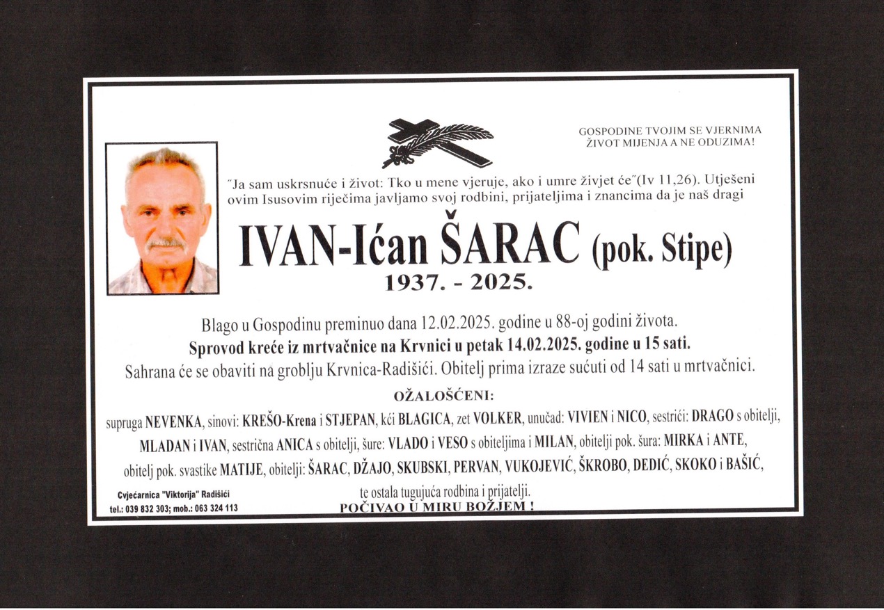pok. Ivan Ićan Šarac (pok. Stipe) 12/02/2025 Radišići Port@l Total Views: 3622Share on FacebookPost on X