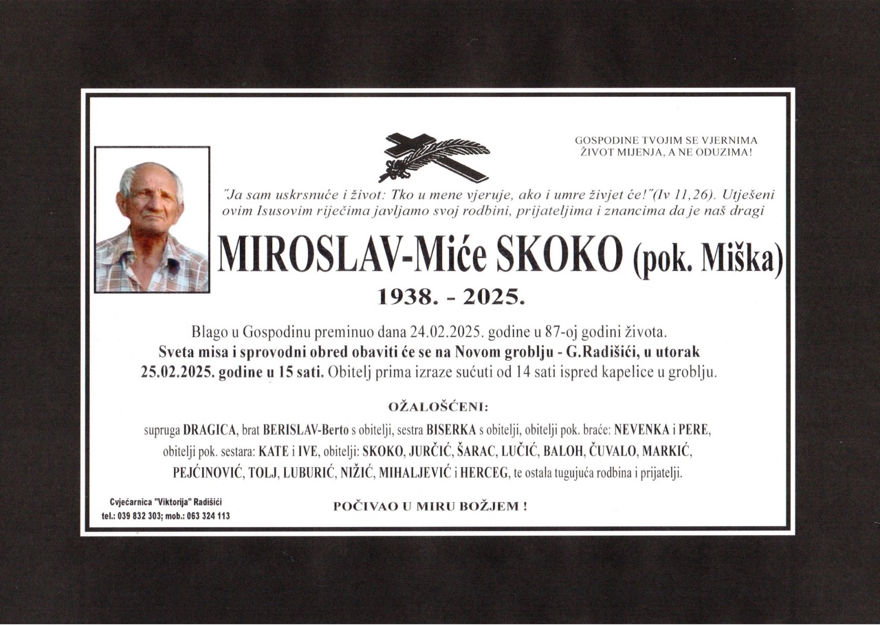 pok. Miroslav- Miće Skoko (pok. Miška) 24/02/2025 Radišići Port@l Total Views: 2671Share on FacebookPost on X
